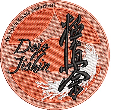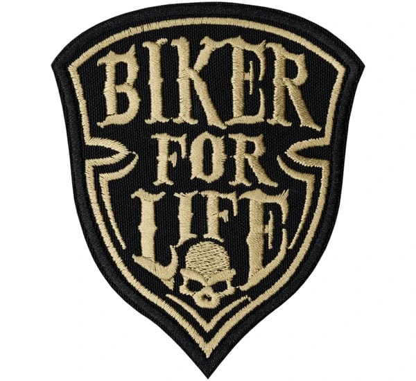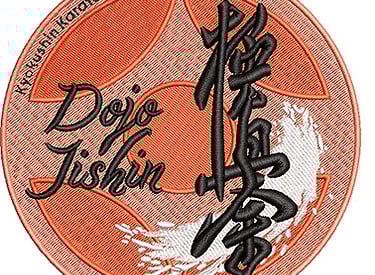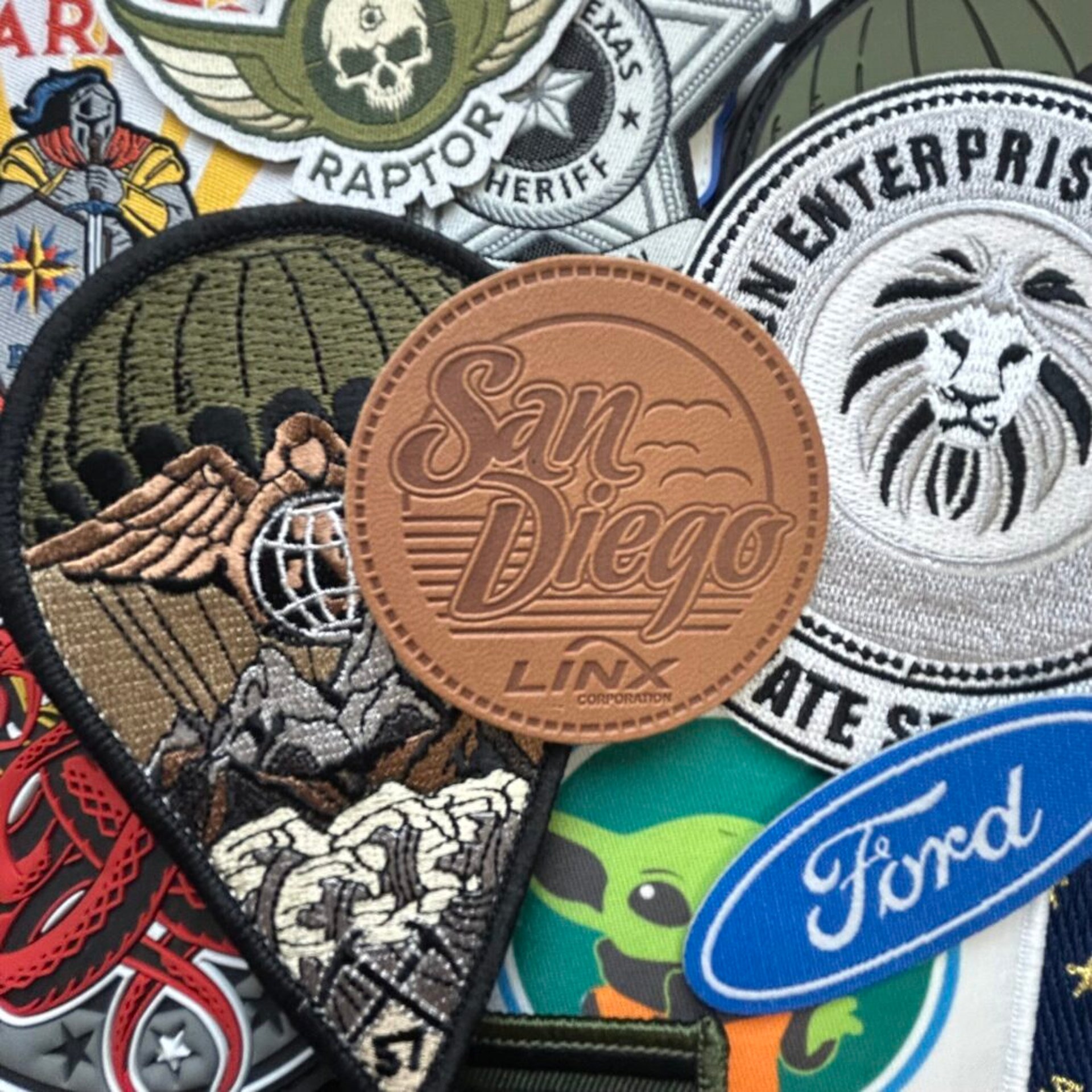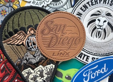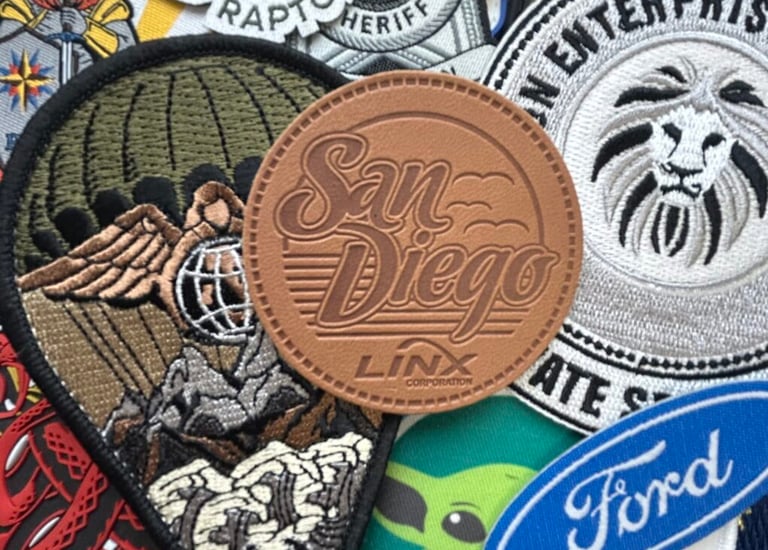 Close-up of a colorful embroidered patch featuring a detailed logo design on fabric.